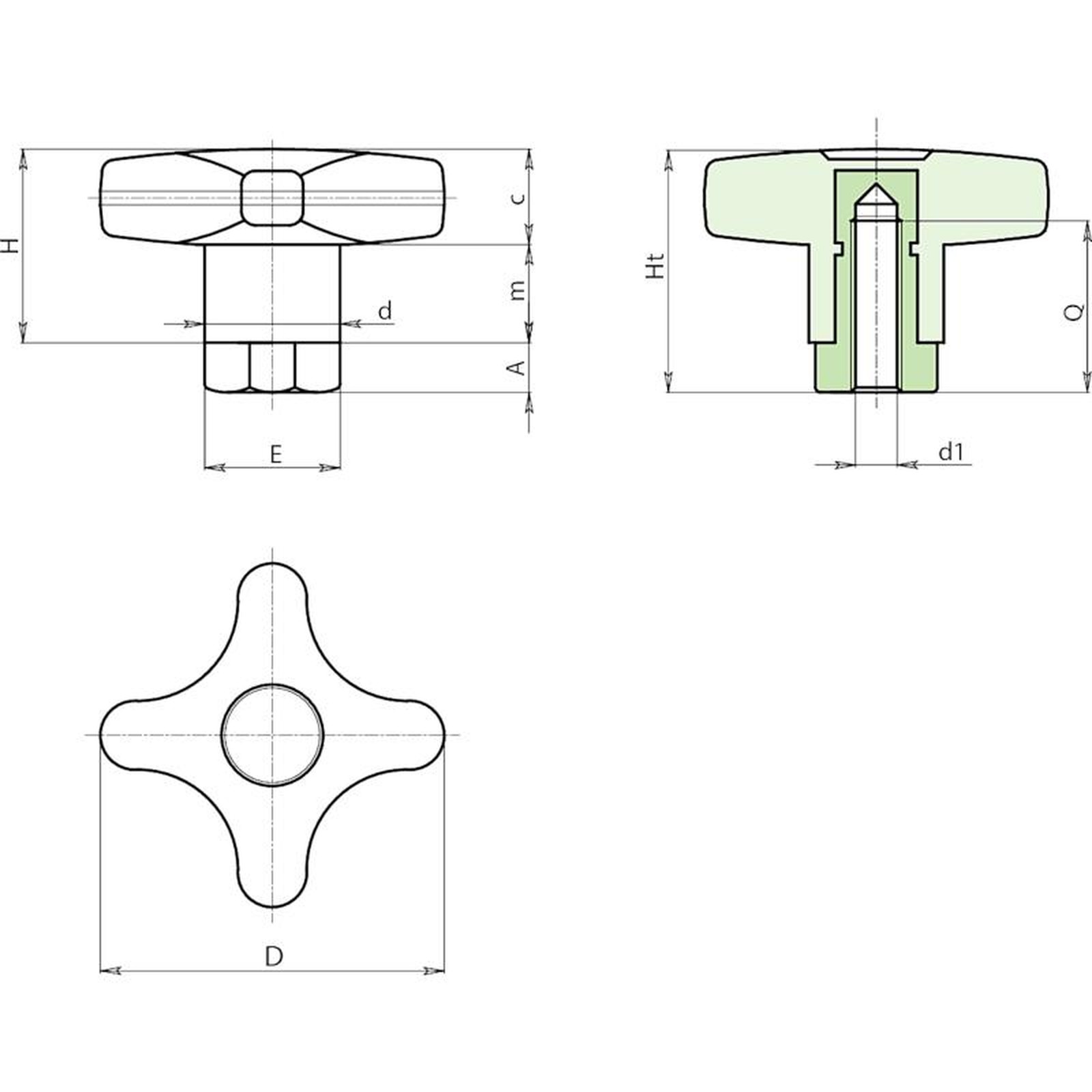 | Código | Art. | D | d | H | Ht | A | E | m | c | d1 6H | Q | Peso (g) |