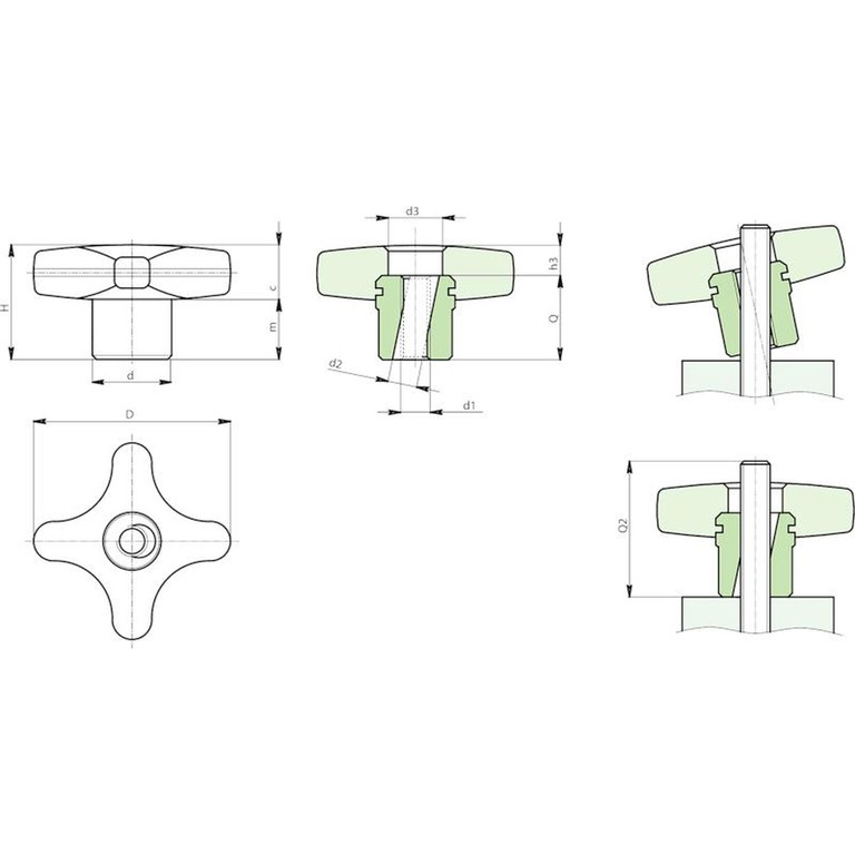 | Código | Art. | D | d | d2 | d3 | H | h3 | m | c | d1 | Q | Q2 | Peso (g) |