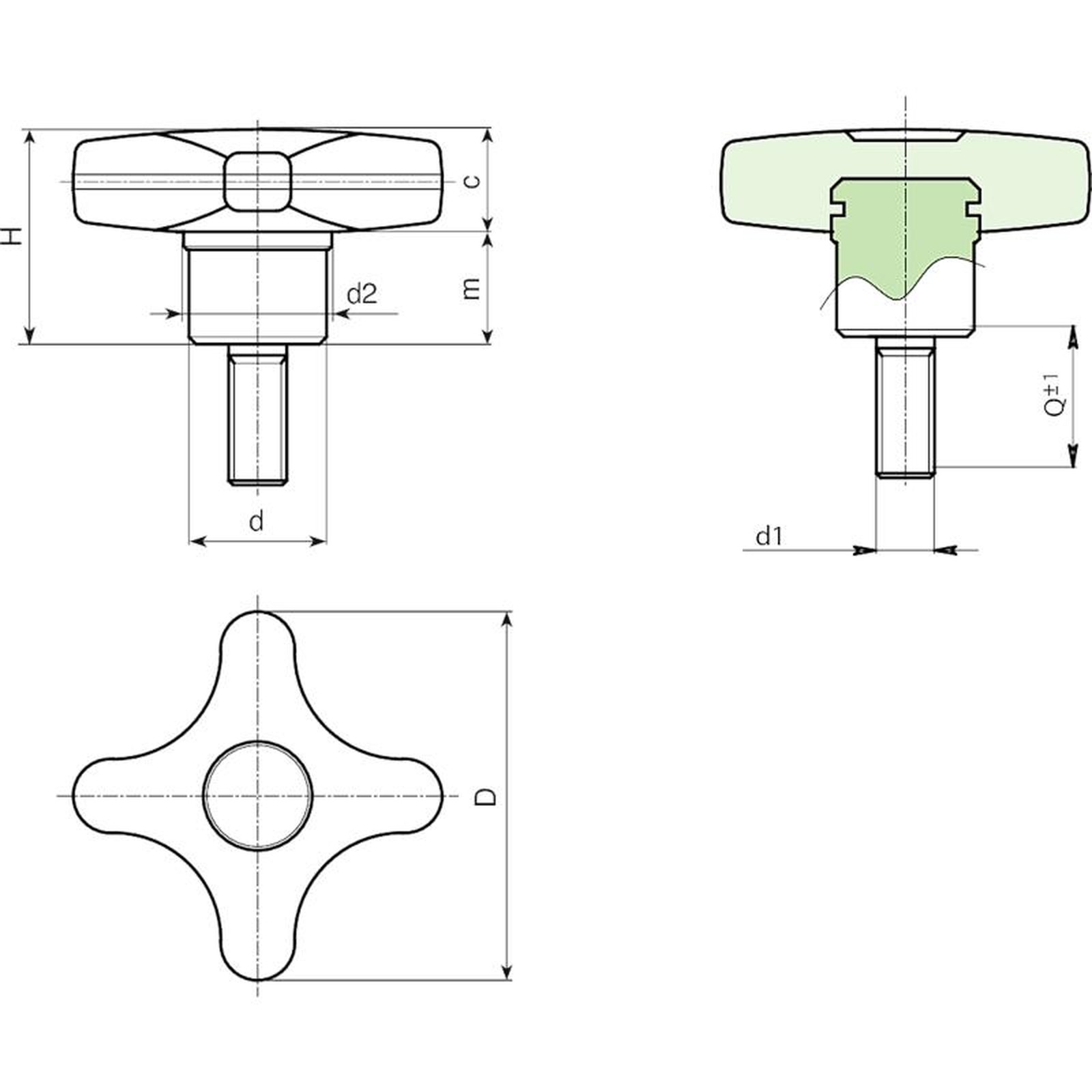 | Código | Art. | D | d | d2 | H | m | c | d1 6g | Q | LM | Peso (g) |