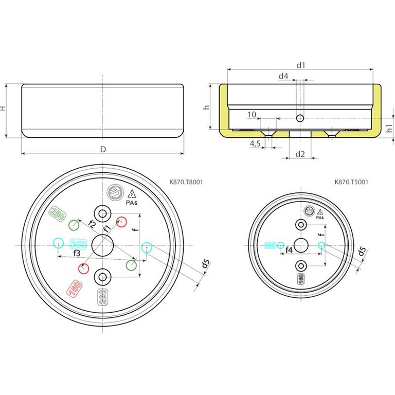 | Código | art. | D | H | h | h1 | d1 ±0,5 | d2 | d3 | d4 | d5 | f | f1 | f2 | f3 | f4 | Peso (g) |