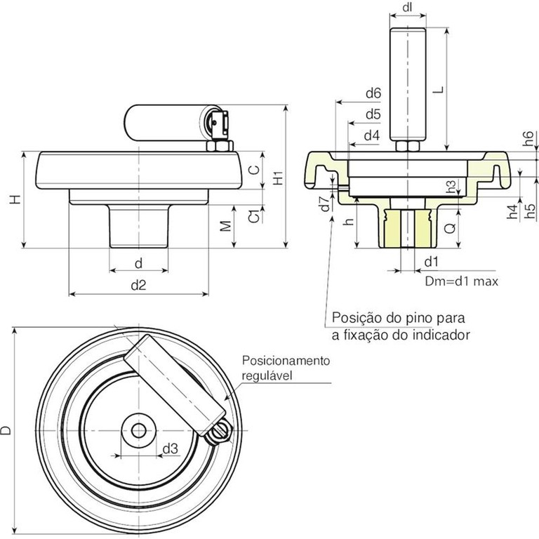 | Código | art. | D | H | H1 | d | d2 | M | C | C1 | d3 | d4 | d5 | d6 | d7 | h | h3 | h4 | h5 | h6 | dl | L | Dm | d1 | Q | Peso (g) |