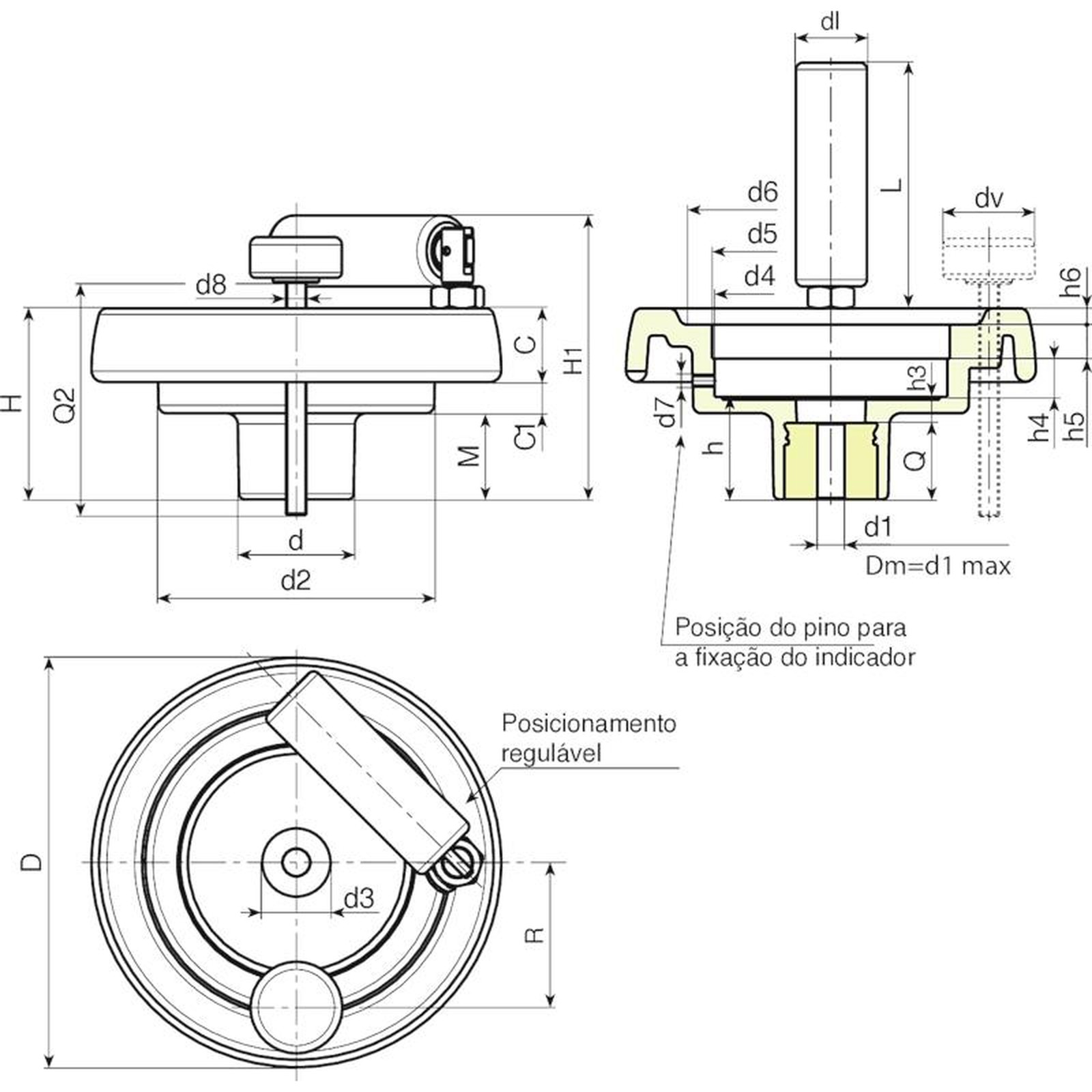 | Código | art. | D | H | H1 | d | d2 | M | C | C1 | d3 | d4 | d5 | d6 | d7 | h | h3 | h4 | h5 | h6 | R | d8 | dl | L | Dm | d1 | Q | Peso (g) |
