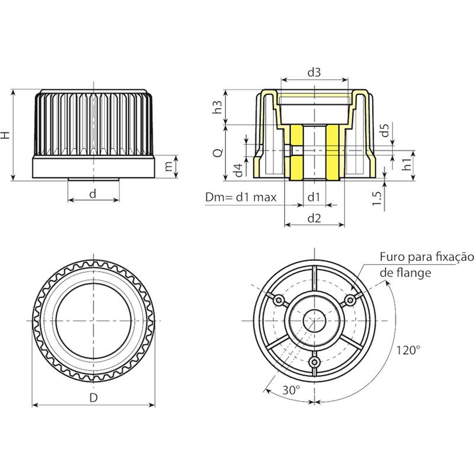 | Código | Art. | D | H | m | d | d2 | d3 | d4 | d5 | h1 | h3 | Dm | d1 H10 | Q | Peso (g) |
