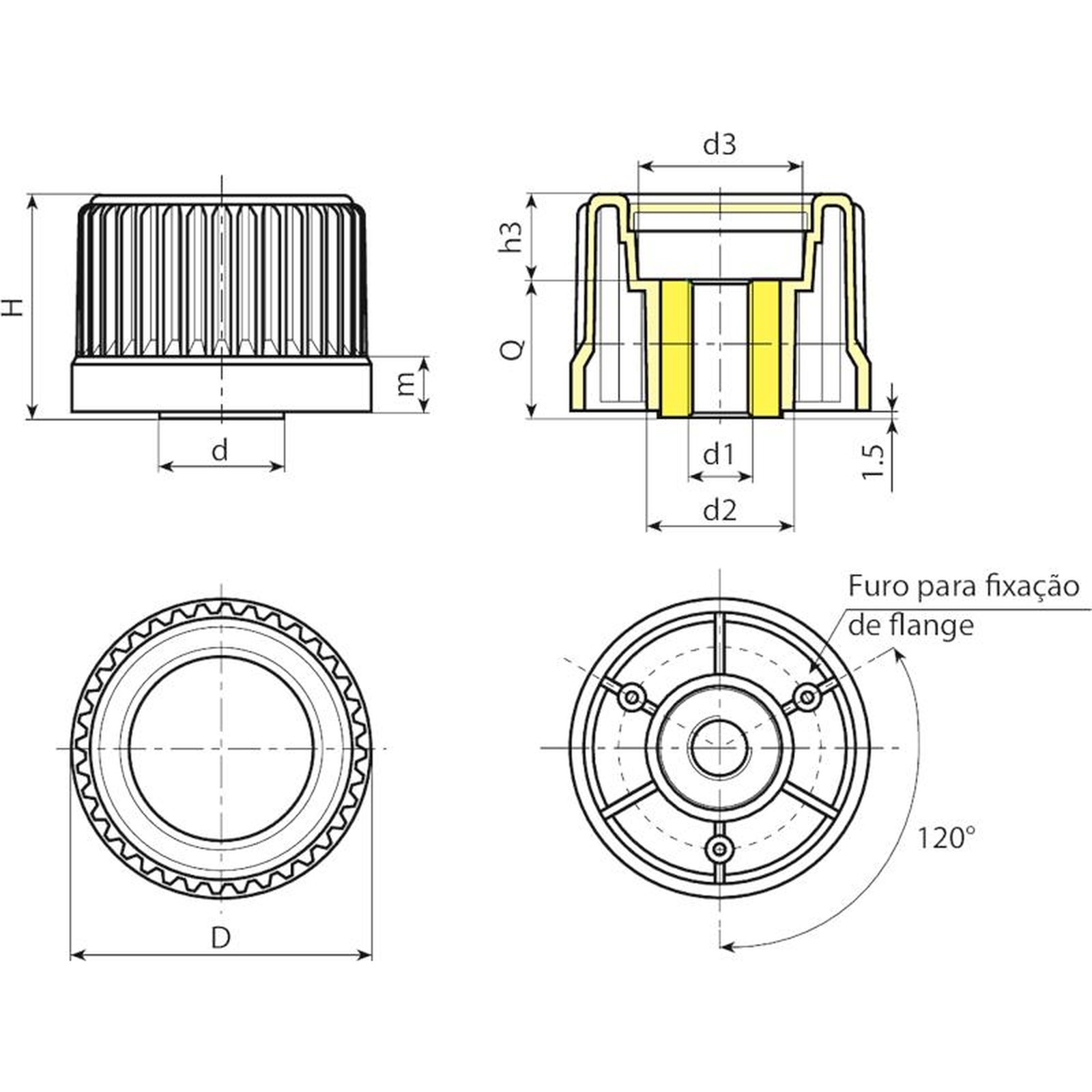 | Código | Art. | D | H | m | d | d2 | d3 | h3 | d1 6H | Q | Peso (g) |