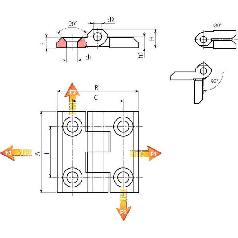 | Código | Art. | I | C | A | B | H | h | h1 | d2 | d1 | Peso (g) | F1 (N) | F2 (N) |