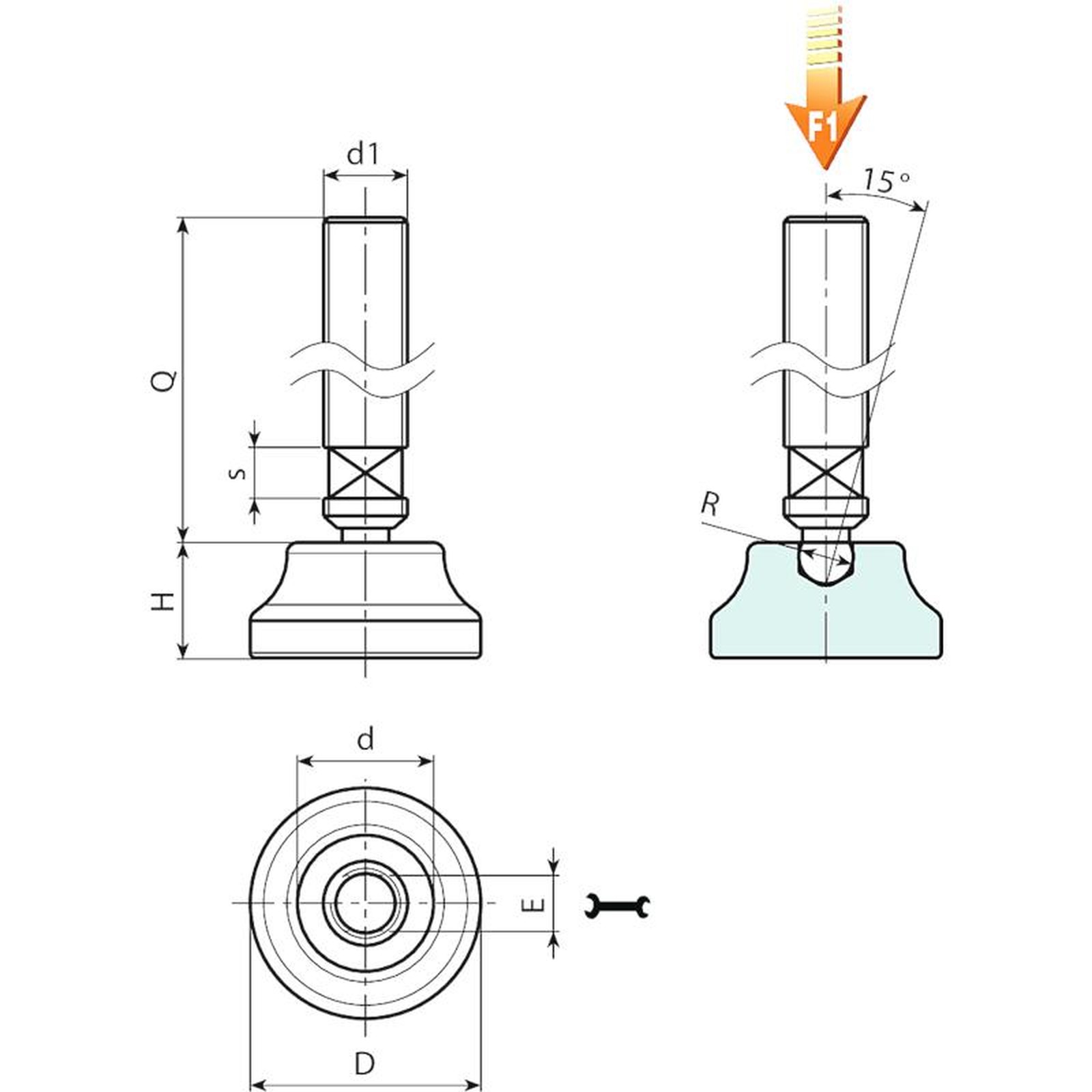 | Código | Art. | D | H | d | E | s | R | d1 6g | Q | Peso (g) | F1 (kN) |