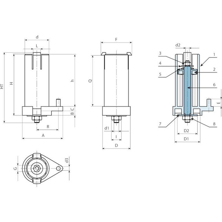 | Código | art. | D | D1 | D2 | HT | H | d | d1 | d2 | d3 | h | A | B | C | E | F | G | I | L | Q | R | Peso (g) |