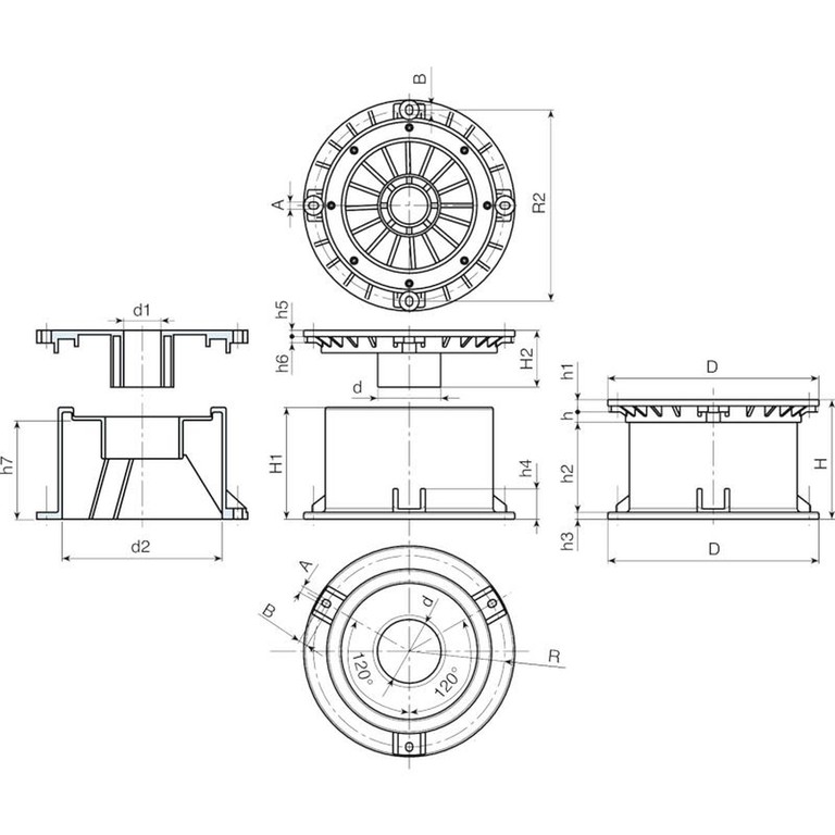| Código | art. | D | H | H1 | H2 | d | d1 | d2 | h | h1 | h2 | h3 | h4 | h5 | h6 | h7 | R | R1 | A | B | Peso (g) |
