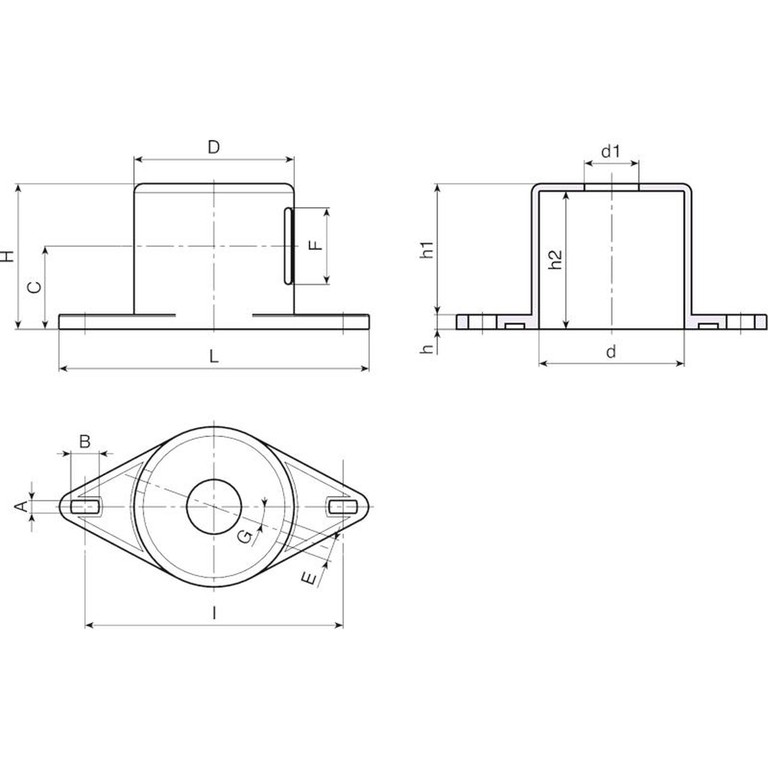| Código | Art. | H | D | d | L | I | A | B | E | F | G | C | h | h1 | h2 | d1 | Peso (g) |