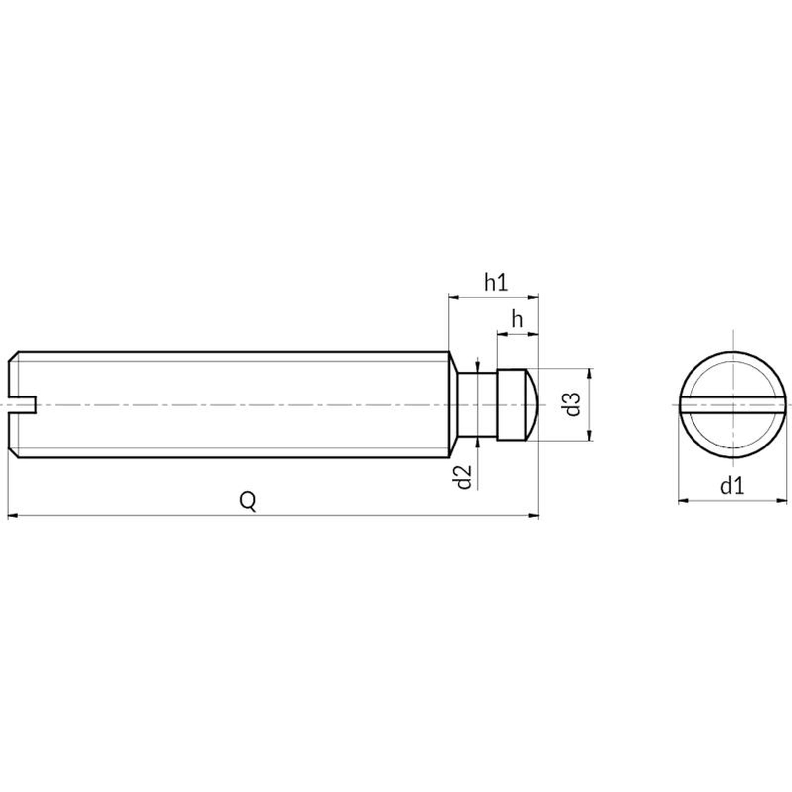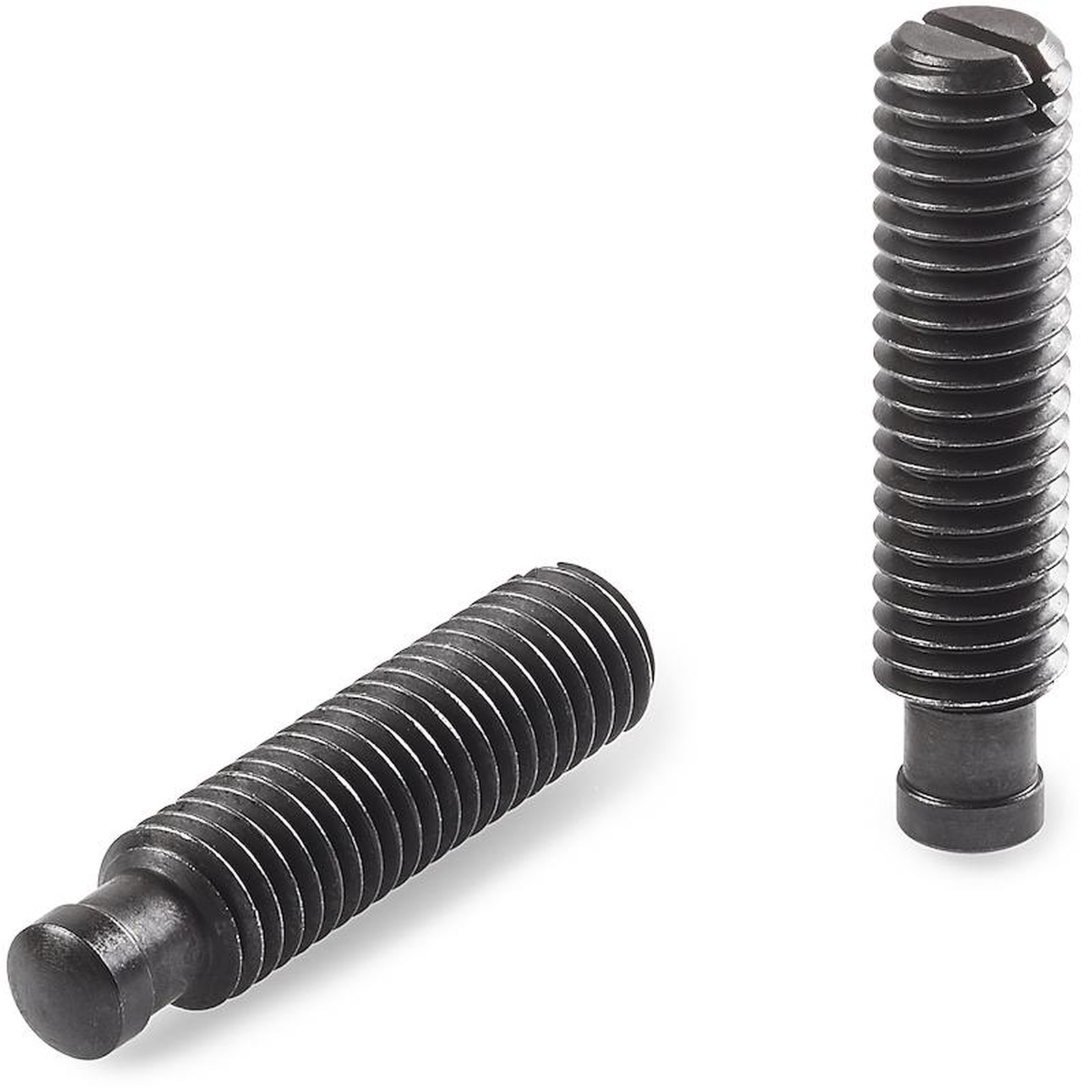 Perno roscado em aço, com fenda para chave de parafusos e ponteira cimentada.