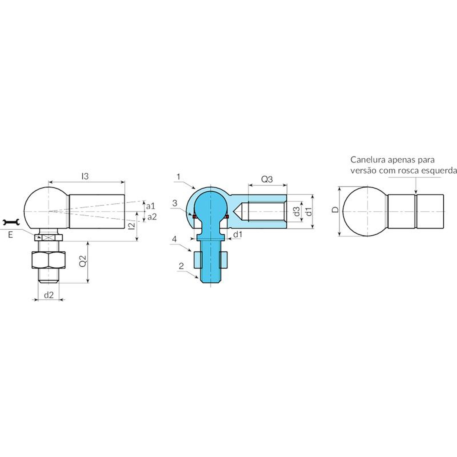 Rosca esquerda (tolerância de rosca 6H). Distinguível pela presença de canelura na rótula.
