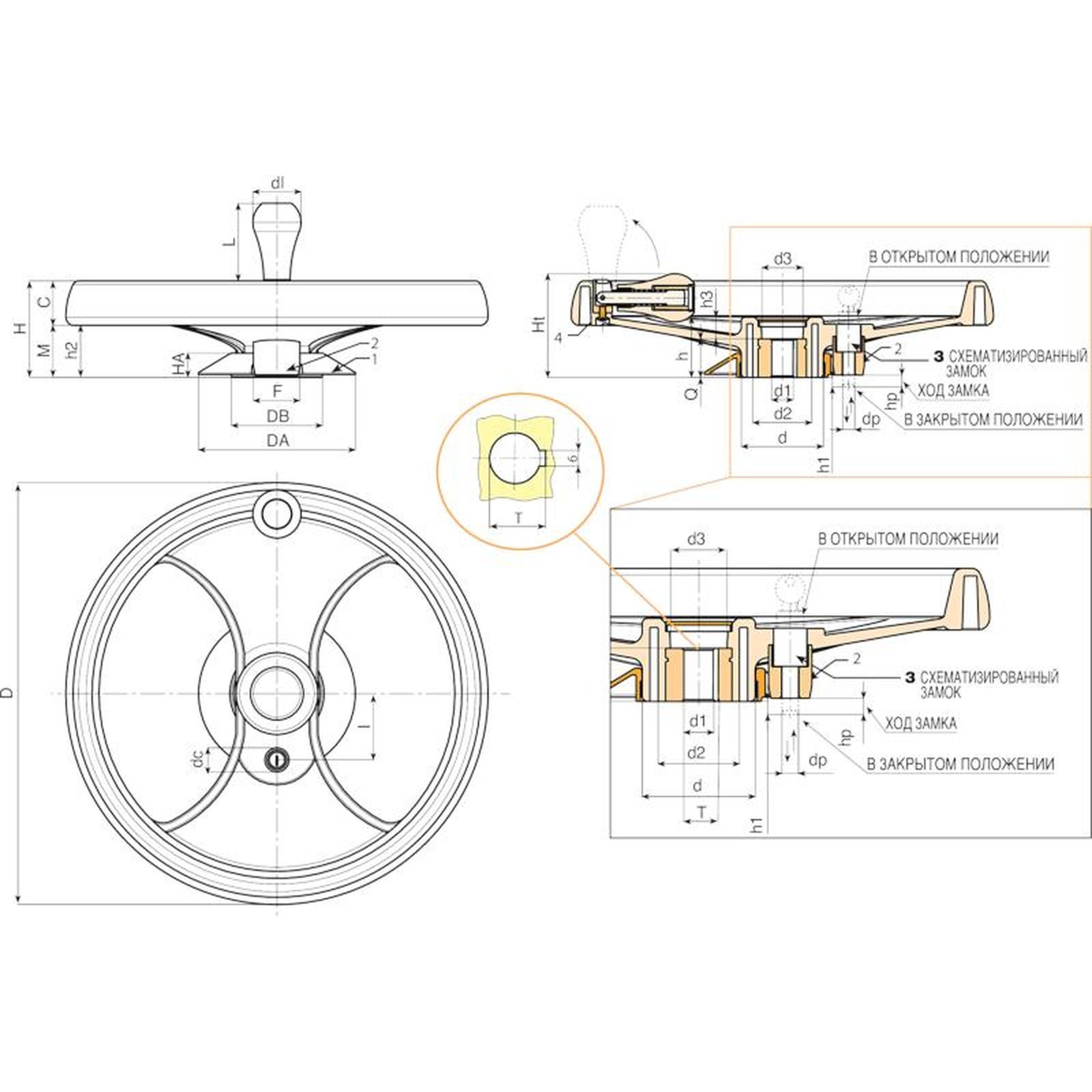 Поворотная и складная откидная рукоятка внутри маховика M202 “Euromodel”, с шестигранным соединением. Рукоятка из полиамида PA6+GF черного цвета RAL 9011. Внутренний механизм из вороненой стали. Крепление с помощью винта с вороненой отделкой с головкой в виде шестигранной кнопки ISO 7838. Пробка рукоятки из серого полиамида (RAL 7035 код 13).