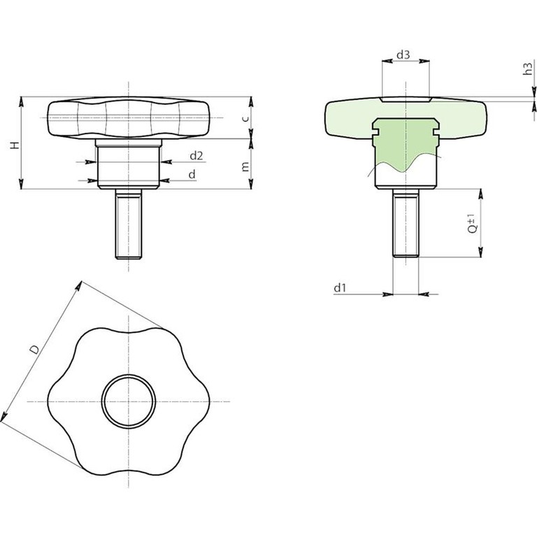 | Код | Арт. | D | d | d2 | d3 | H | h3 | m | c | d1 6g | Q | LM | Вес (г) |