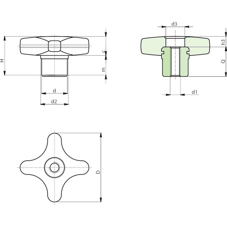 | Код | Арт. | D | d | d2 | d3 | H | h3 | m | c | d1 6H | Q | Вес (г) |
