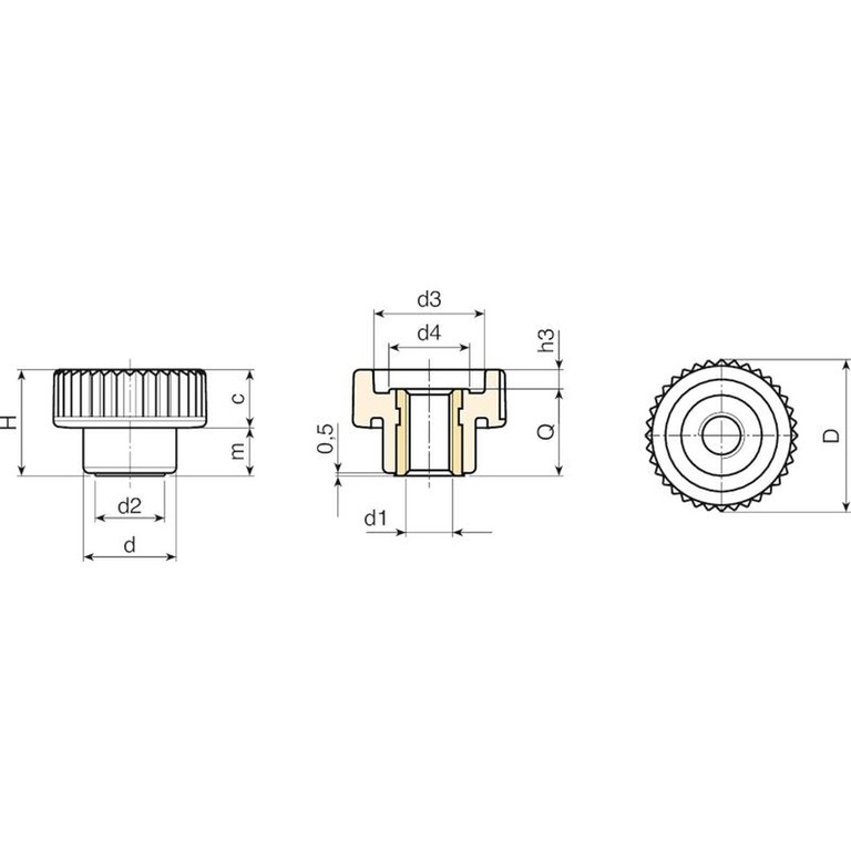 | Код | арт. | D | H | d | m | c | d2 | d3 | d4 | h3 | d1 6H | Q | Вес (г) |