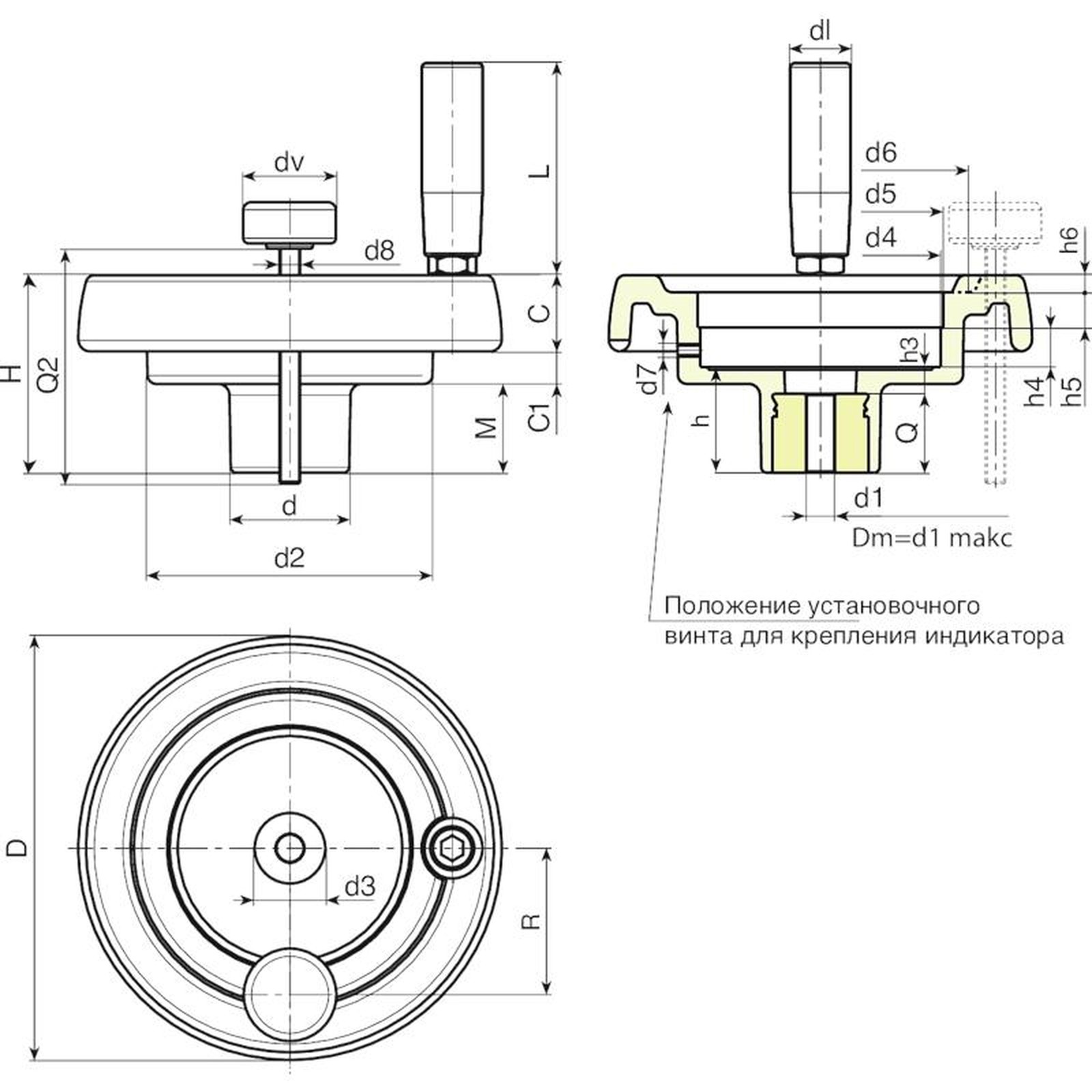 МАХОВИК УПРАВЛЕНИЯ ПОЛНОТЕЛЫЙ С ГНЕЗДОМ ДЛЯ ИНДИКАТОРА, С ПОВОРОТНОЙ РУКОЯТКОЙ И ФИКСИРУЮЩЕЙ РУЧКОЙ