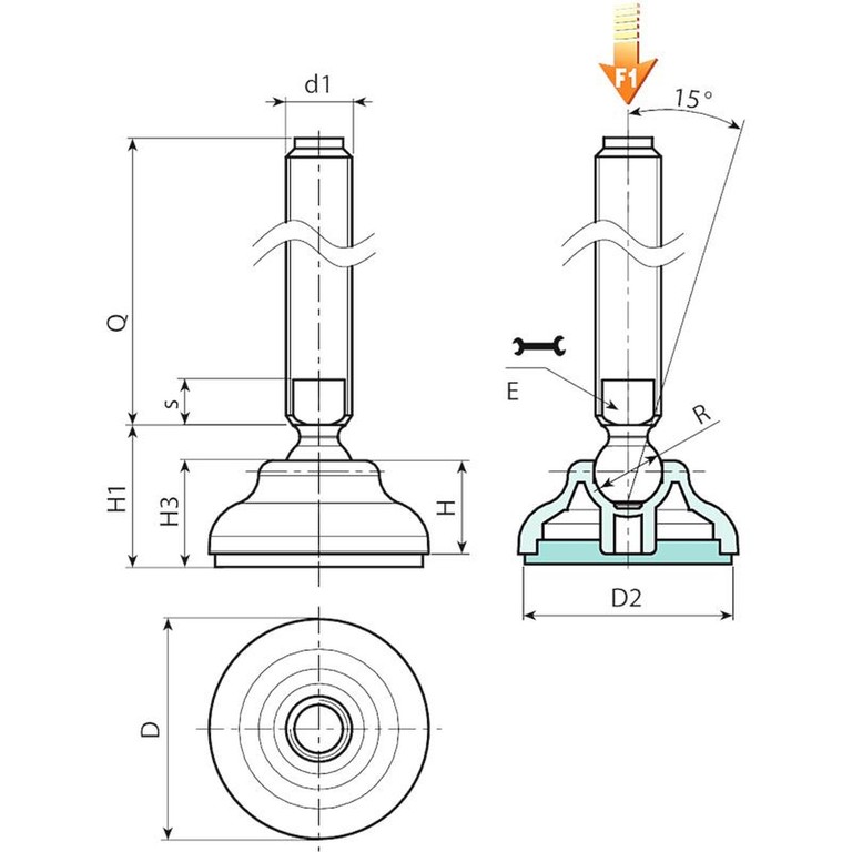 | Код | Арт. | D | D2 | H | H1 | H3 | E | s | R | d1 6g | Q | Вес (г) | F1 (kN) |