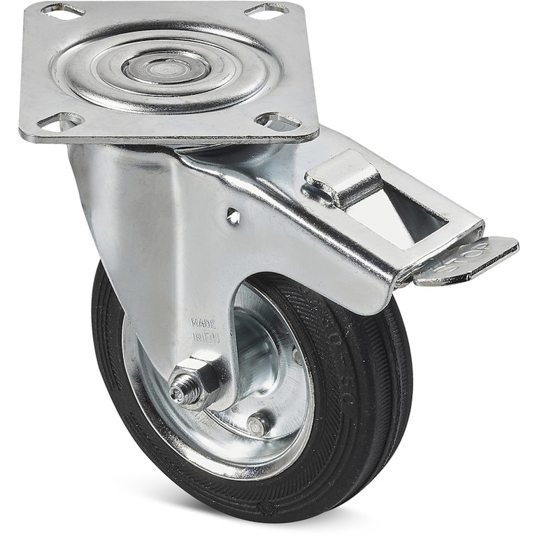 КОЛЕСО С ОБОДОМ ИЗ ЛИСТОВОГО МЕТАЛЛА / РЕЗИНОВОЙ ШИНОЙ, СО СТАЛЬНОЙ ПОВОРОТНОЙ ПРЯМОУГОЛЬНОЙ ПЛАТФОРМОЙ, С ТОРМОЗОМ